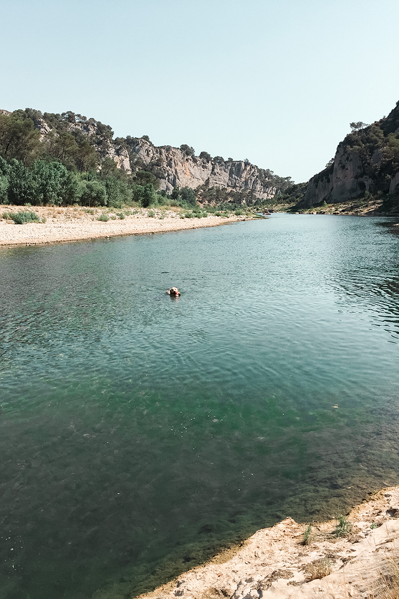 Le parcours alterne entre des passages en forêt et les bords du Gardon sur environ 5 à 6 kilomètres jusqu’à La Baume toujours tout droit (voir cani-carte plus bas dans l’article). Vous y découvrirez plusieurs plages le long du Gardon, idéales pour faire nager votre truffinette et jouer avec lui en toute sécurité. Hannah a nagé à de nombreuses reprises pour son plus grand bonheur.