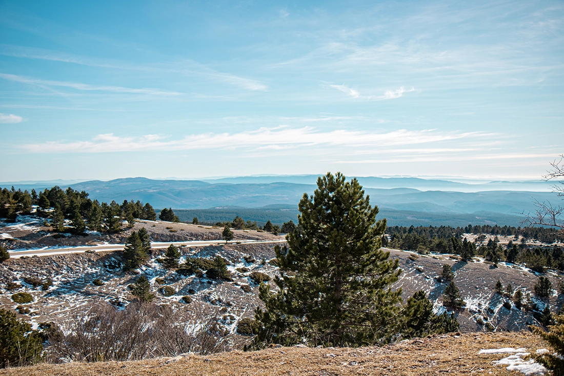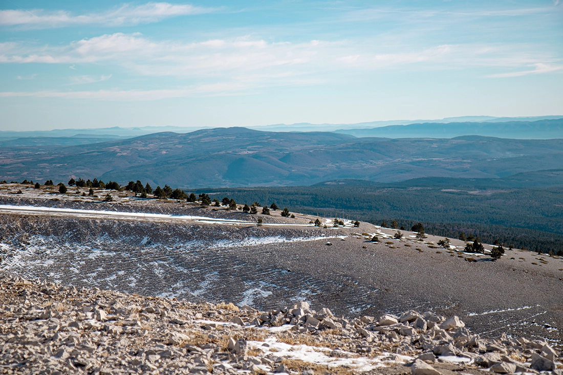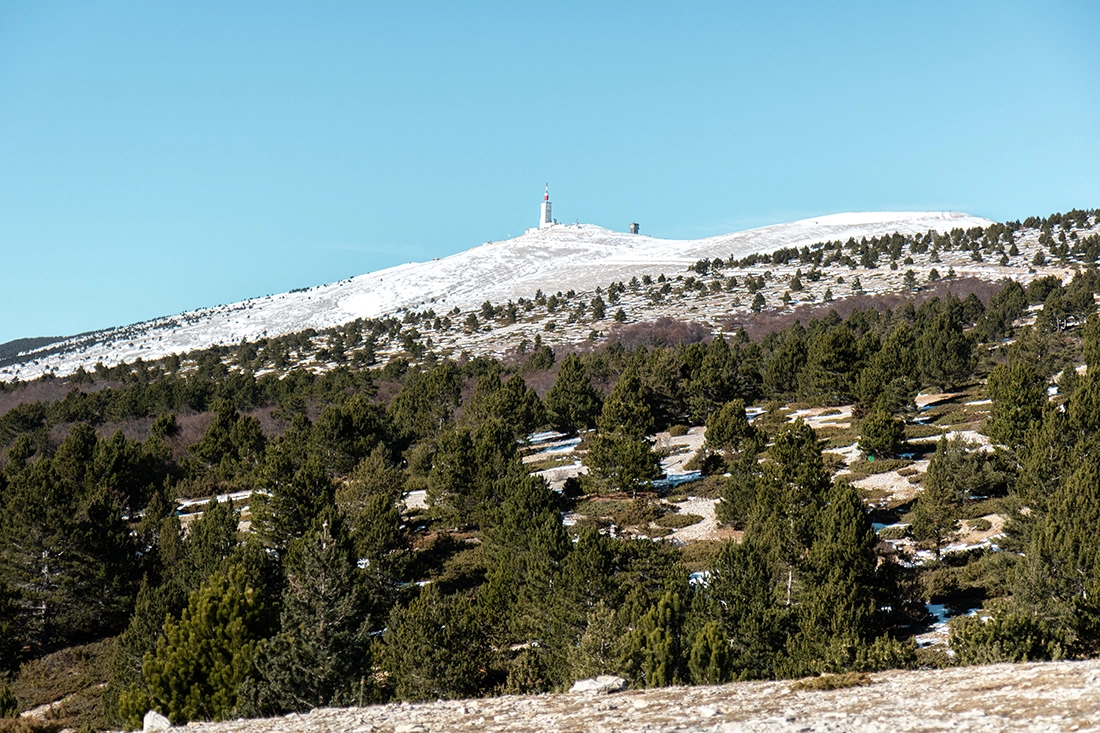 Nous nous sommes rendus au Mont Ventoux par le versant sud fin décembre. L’hiver étant particulièrement doux cette année, il n’y avait malheureusement pas beaucoup de neige. Malgré tout, suffisamment pour que le col soit fermé aux véhicules.