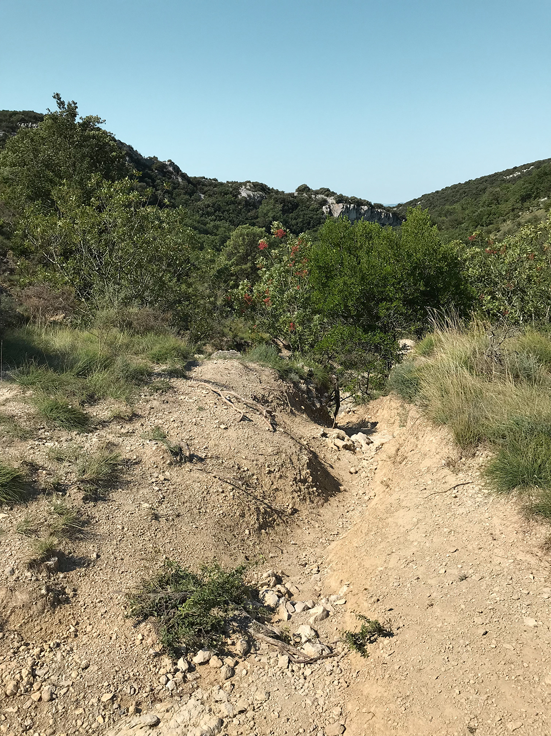 – Vous allez ensuite arriver à un cul de sac. Sur votre gauche, vous descendez le chemin rocailleux, avec des grosses racines (attention à vous dans la descente). Vous voila arrivée dans les Petites Aiguières. (Photo 11 & 12)